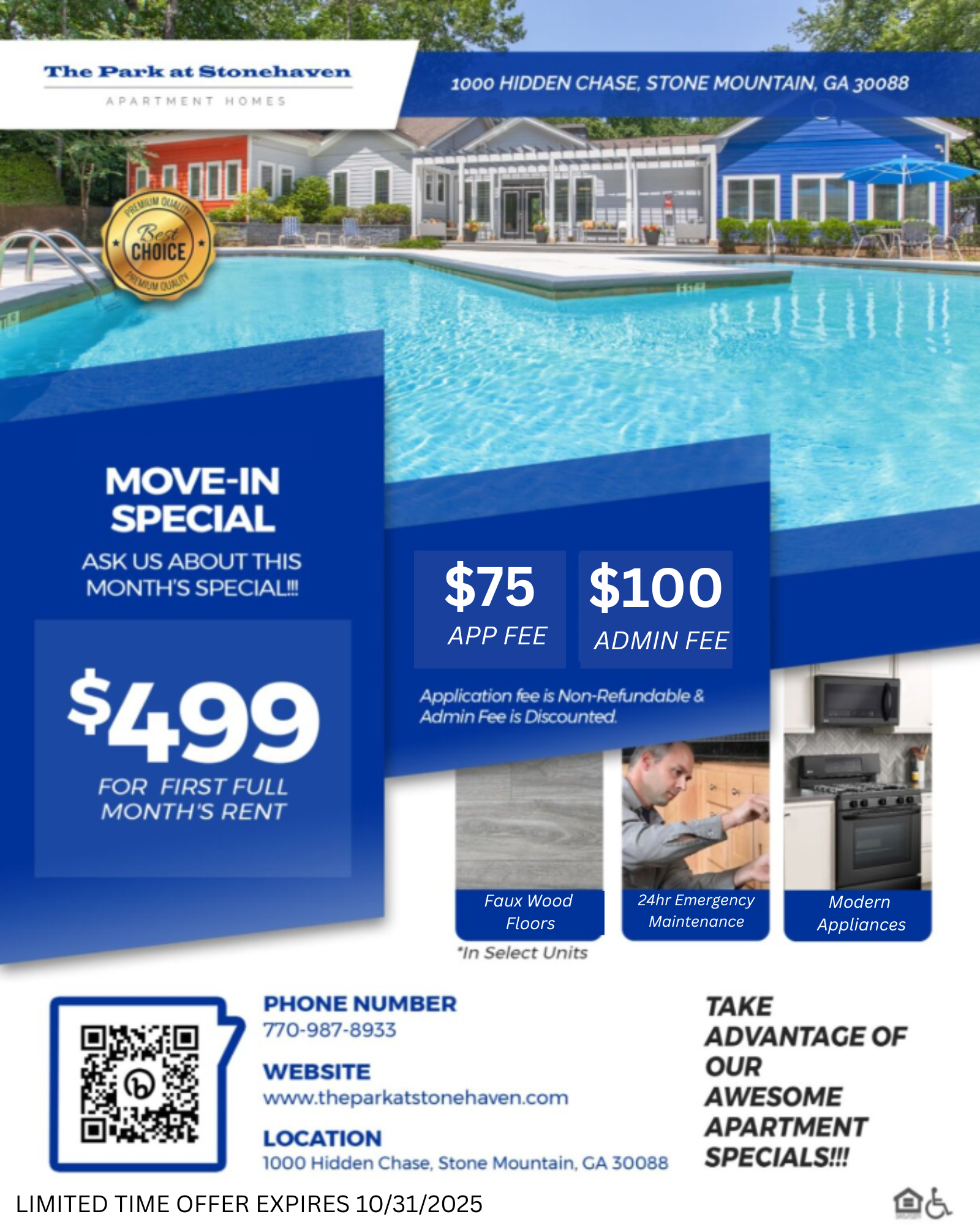 đ October Specials Are Here! đ Take advantage of our limited-time Move-In Deals and step into the comfort and convenience youâve been waiting for. đĄ First full Monthâs Rent is just $499 + Free Ring Doorbell Camera after Move-In Whether youâre starting fresh or upgrading your lifestyle, October is the perfect time to make your move! đ˛ Call or visit us today â these fall savings wonât last long! đ
